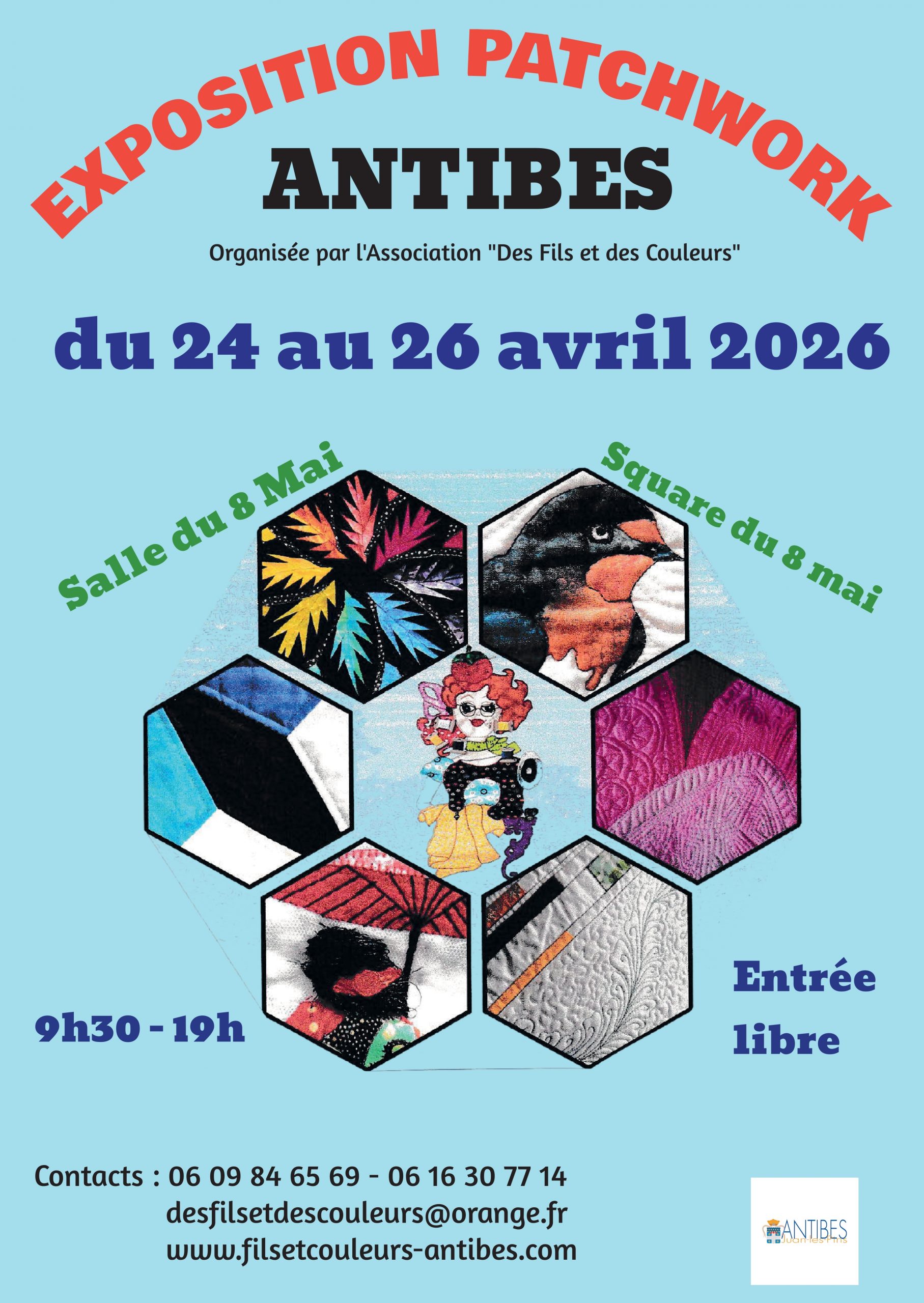 L’association «Des Fils et des Couleurs» organise tous les 2 ans une exposition de patchwork à Antibes, l’occasion d’admirer des patchworks traditionnels, contemporains et innovants, ainsi que des créations plus artistiques des membres de notre association. Prochain rendez-vous: du 24 au 26 avril 2026